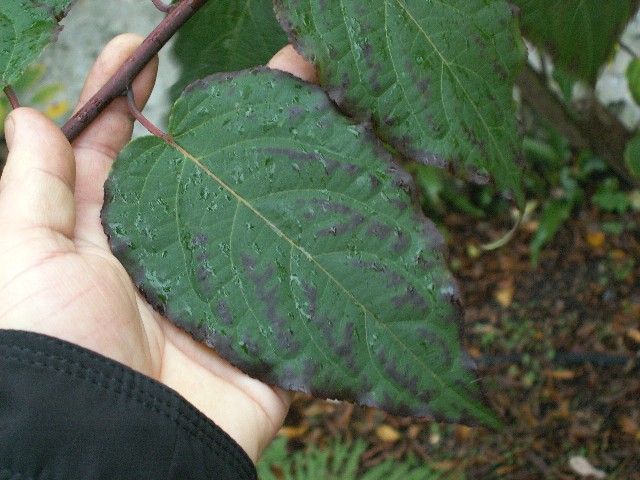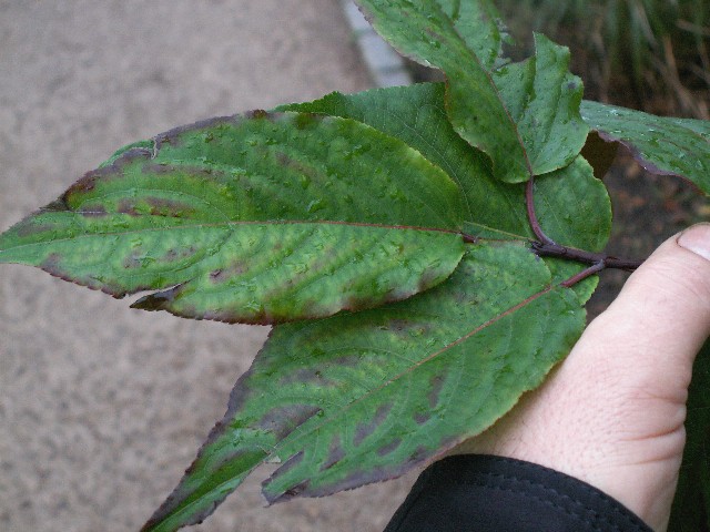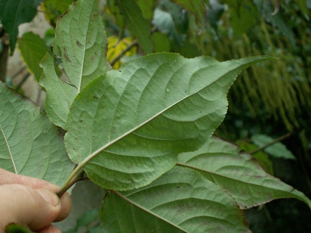 szerokości. Liście zielone, jajowate, pędy koloru purpurowego, lekko