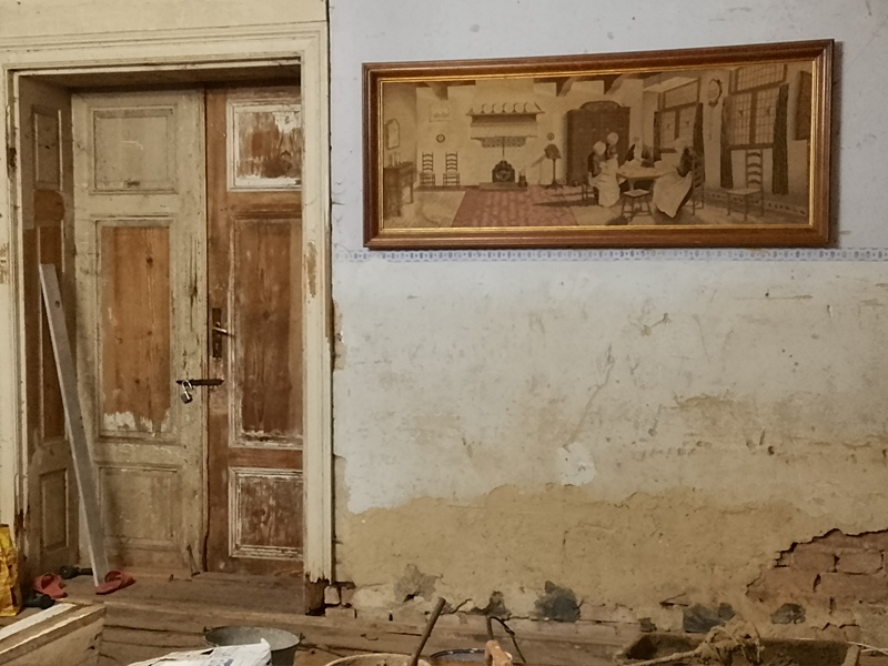 - zegar, szafa, szafka, krzesła, wspornik pod biblię, kominek, talerze