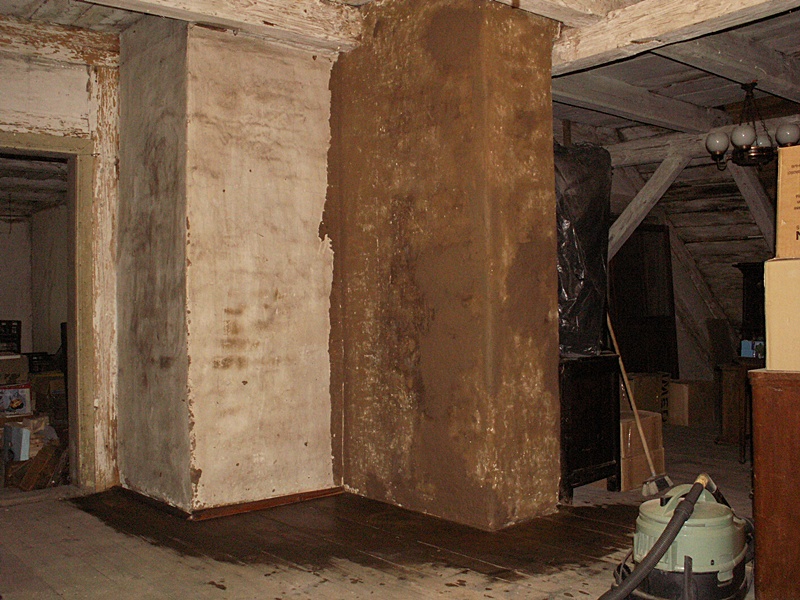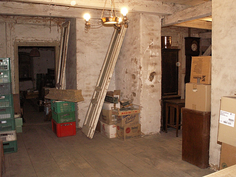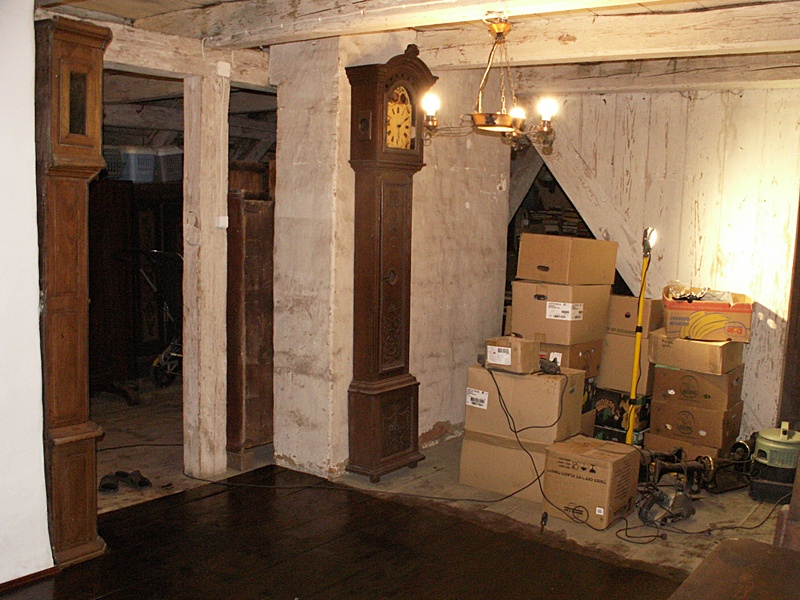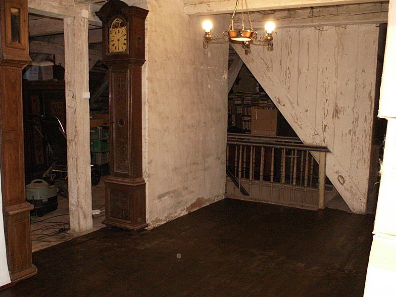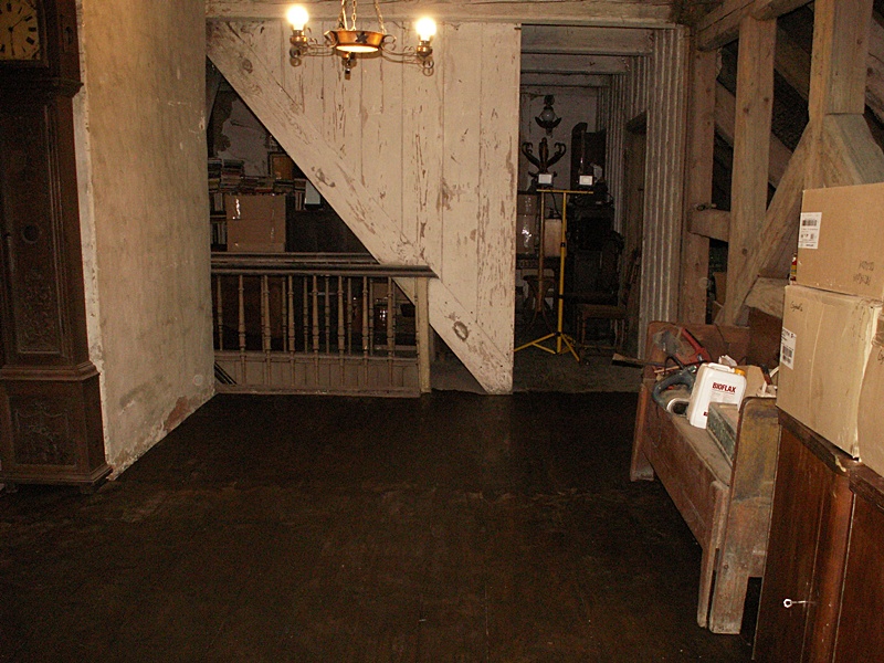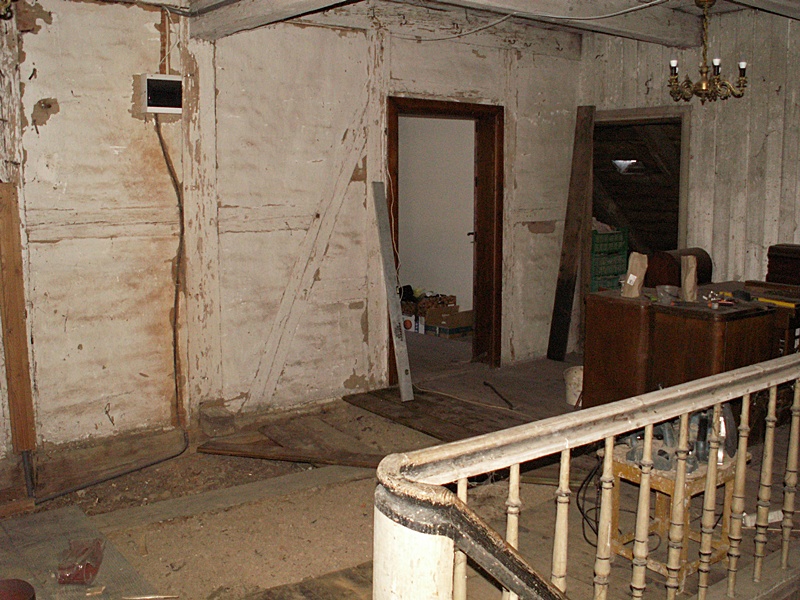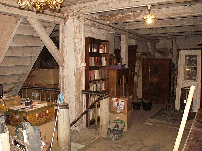 Jest to najciekawsze miejsce w całym domu. Po naprawach, renowacji, doświetleniu oknami połaciowymi i ociepleniu dachu ma szansę stać się bardzo klimatycznym miejscem, pełnym drzwi i różnych zakątków, zachęcającym, aby zalec w fotelu z książką i wsłuchiwać się w odgłosy bardzo starego domu i jego otoczenia. Na razie podłoga nie jest jeszcze w pełni naprawiona. W kilku miejscach brakuje desek podłogowych, niektóre belki stropowe pod skosami wymagają wzmocnienia. Hol będzie wypełniony regałami z książkami. 17 stycznia 2009 ![]()