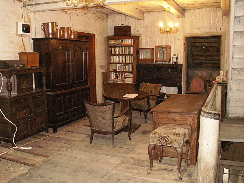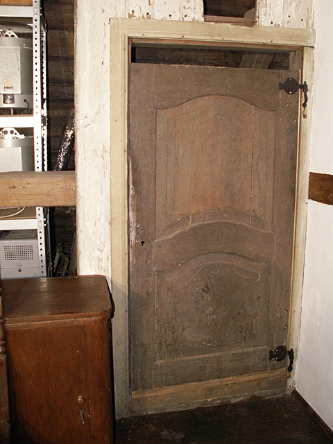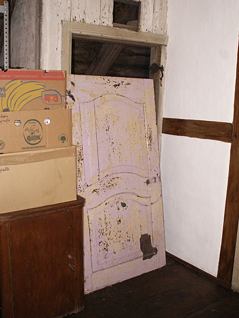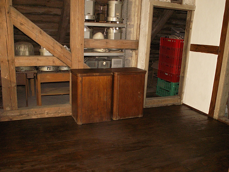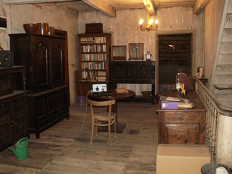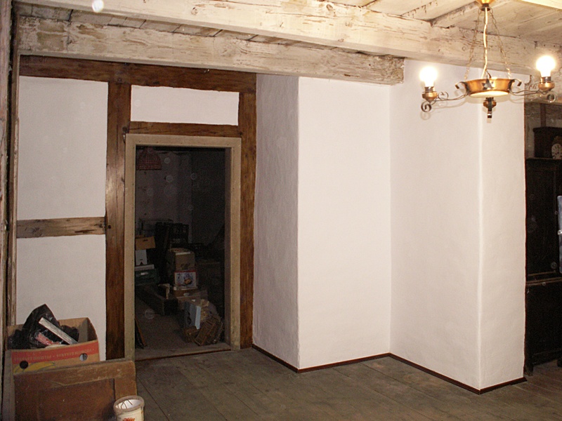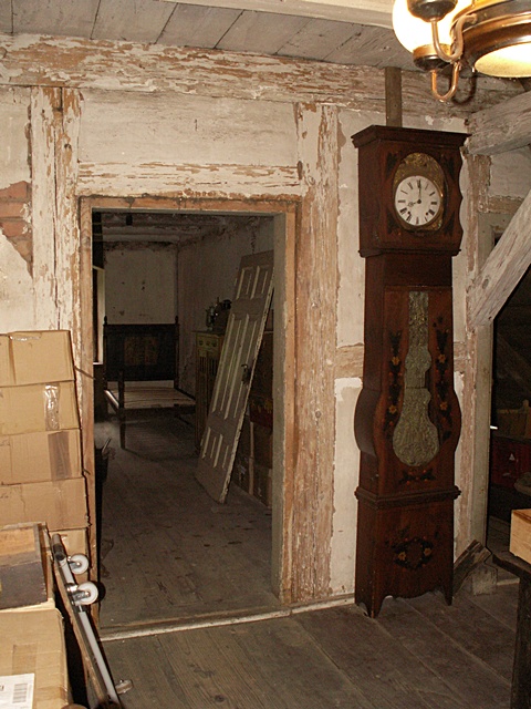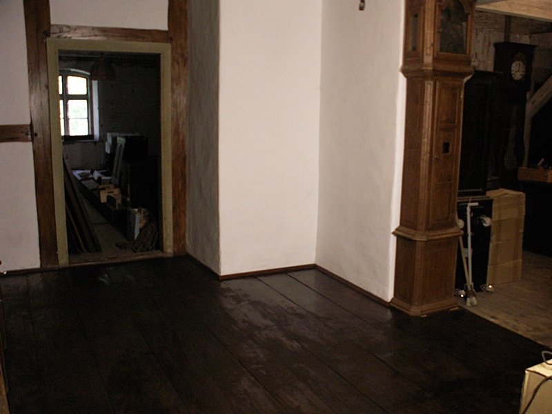 Jest to najciekawsze miejsce w całym domu. Po naprawach, renowacji, doświetleniu oknami połaciowymi i ociepleniu dachu ma szansę stać się bardzo klimatycznym miejscem, pełnym drzwi i różnych zakątków, zachęcającym, aby zalec w fotelu z książką i wsłuchiwać się w odgłosy bardzo starego domu i jego otoczenia. Na razie podłoga nie jest jeszcze w pełni naprawiona. W kilku miejscach brakuje desek podłogowych, niektóre belki stropowe pod skosami wymagają wzmocnienia. Hol będzie wypełniony regałami z książkami. 17 stycznia 2009 ![]()